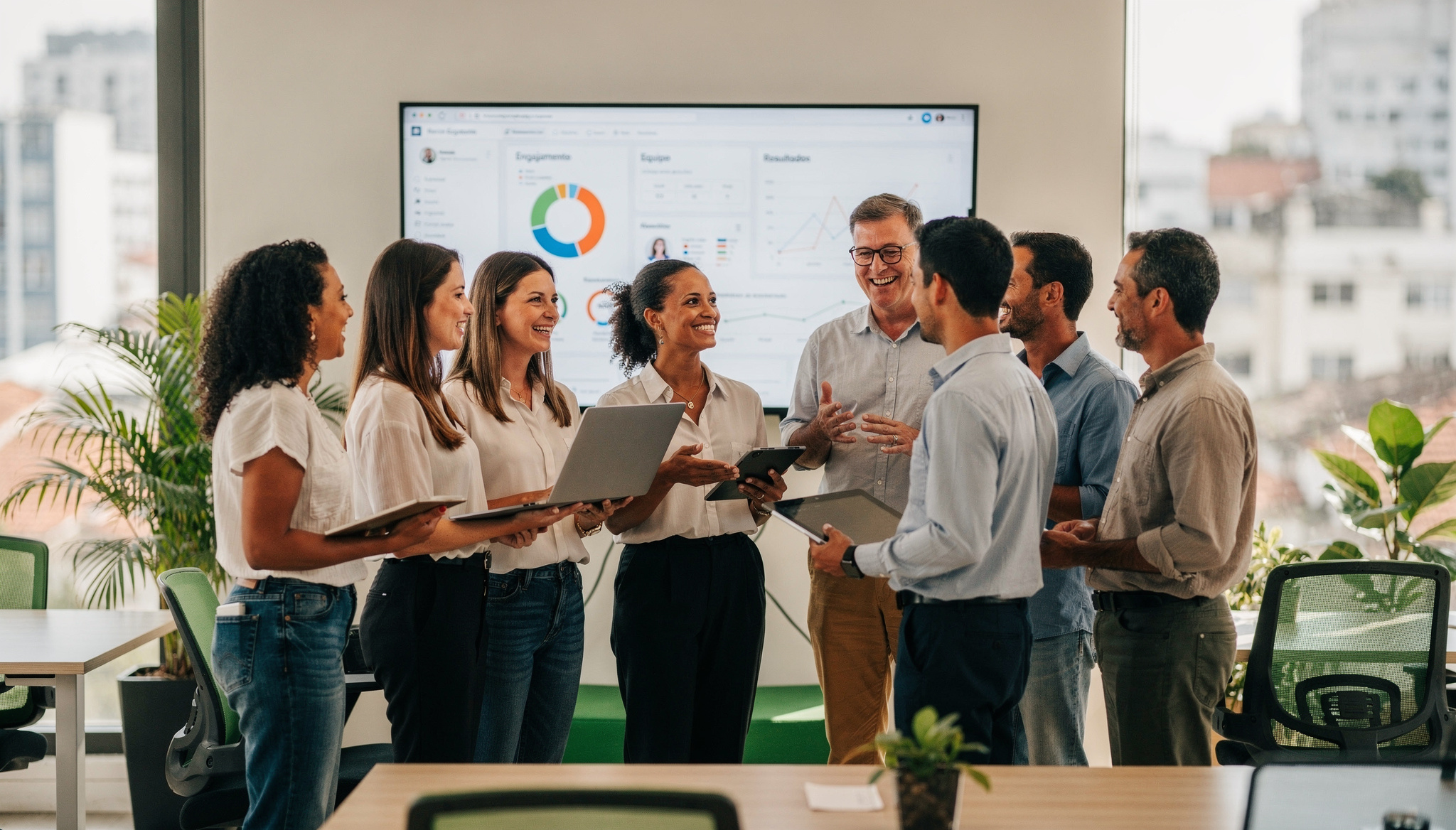 Avisos, links úteis e painéis gerenciais com indicadores em tempo real para líderes.